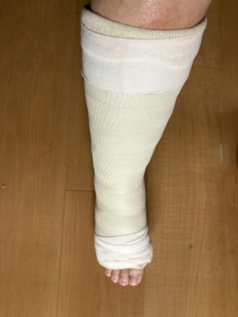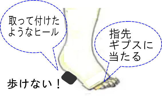 3週経過後ギプス交換の際ギプスにヒールが付けられたが、足首を伸ばして固定されていた上ギプスが邪魔で指先が曲がらず歩行は無理だった。