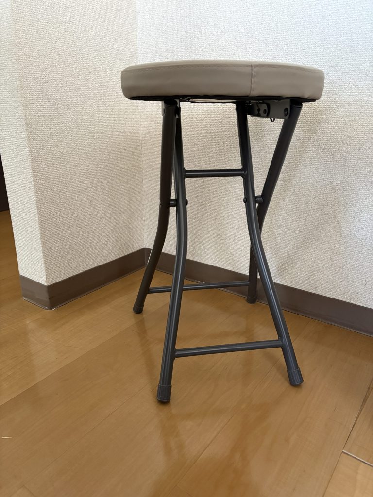 キッチンや洗面など立ったまま作業をするところではギプスの足を床につくわけにいかず、それを見越した息子夫婦がニトリの折り畳み入スツールを買ってきた。