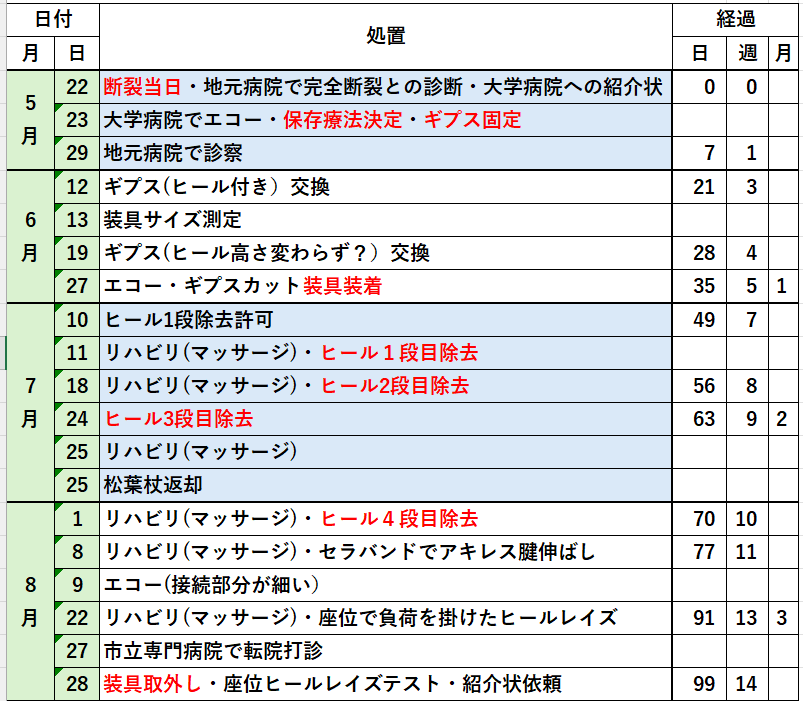 まずは断裂後保存療法決定から装具が外れるまでの経過を一覧にしました。